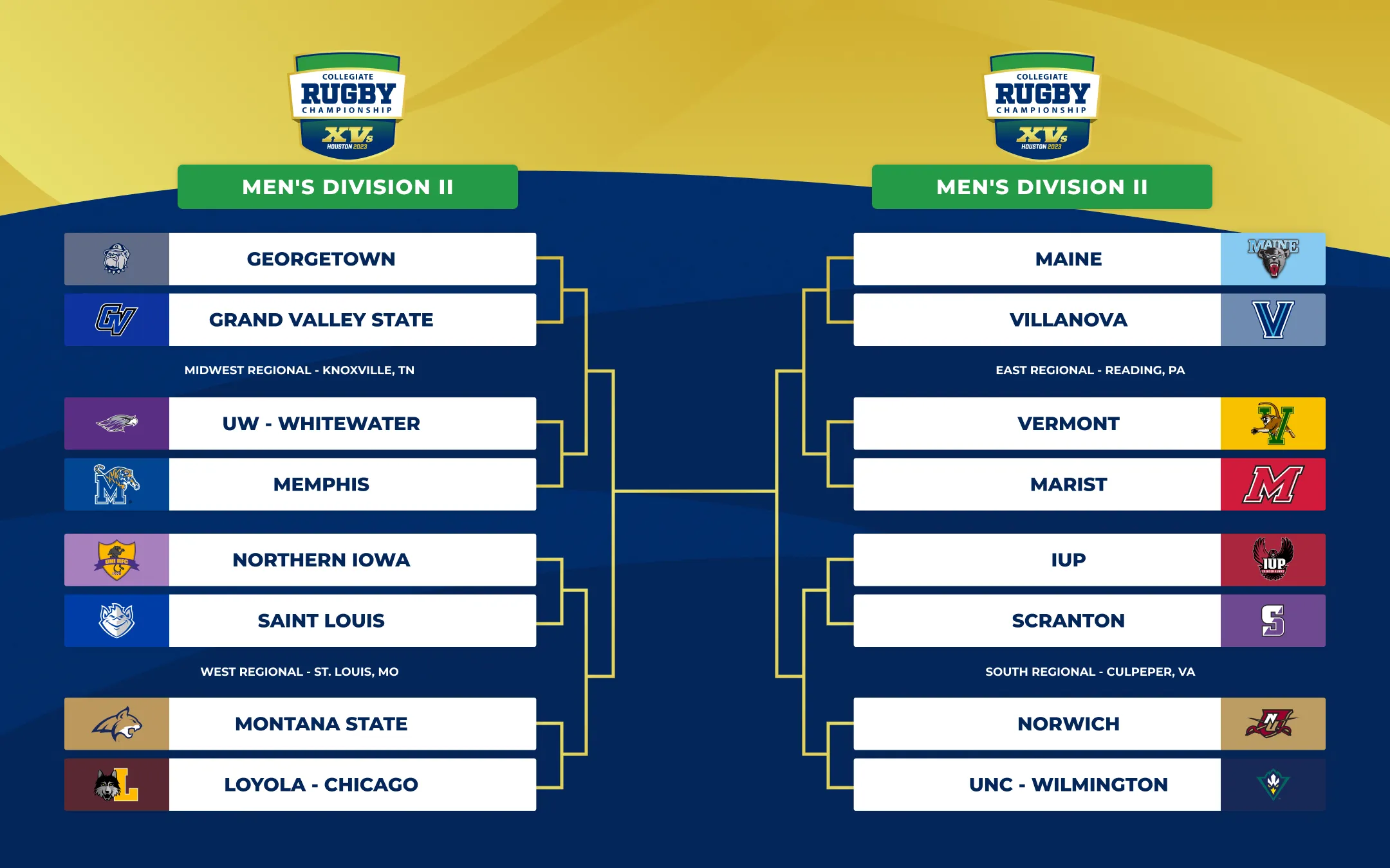Playing in the South Region in Culpeper, VA with IUP and Scranton are New England Wide runner-up Norwich and Southern champion UNC Wilmington. Joining Loyola and Montana State in the West Region in St. Louis are Great Midwest champion Northern Iowa, ranked No. 1 in the country, and Gateway Champion Saint Louis University.