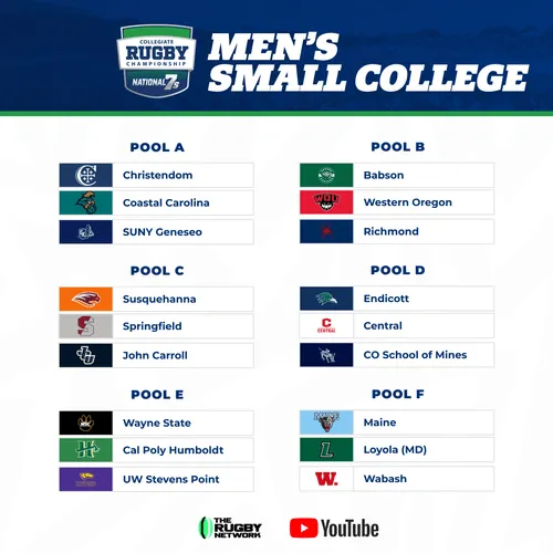 Colonial Coast champion Endicott appears eager to improve their semifinal exit last year. Paired in Pool D with the Gulls are the Central College Dutch, a wrestling team with a rugby problem who lost to Wayne State on an intercept try in the final of their qualifier, and Colorado School of Mines, champions of the High Peaks. The aforementioned Wayne State Wildcats are the slight favorites in Pool E over reigning 15s champion Cal Poly Humboldt and Great Midwest champion Wisconsin-Stevens Point. Pool F pits NERFU champion Maine with MARC runner-up Loyola and Allegheny champion Wabash.