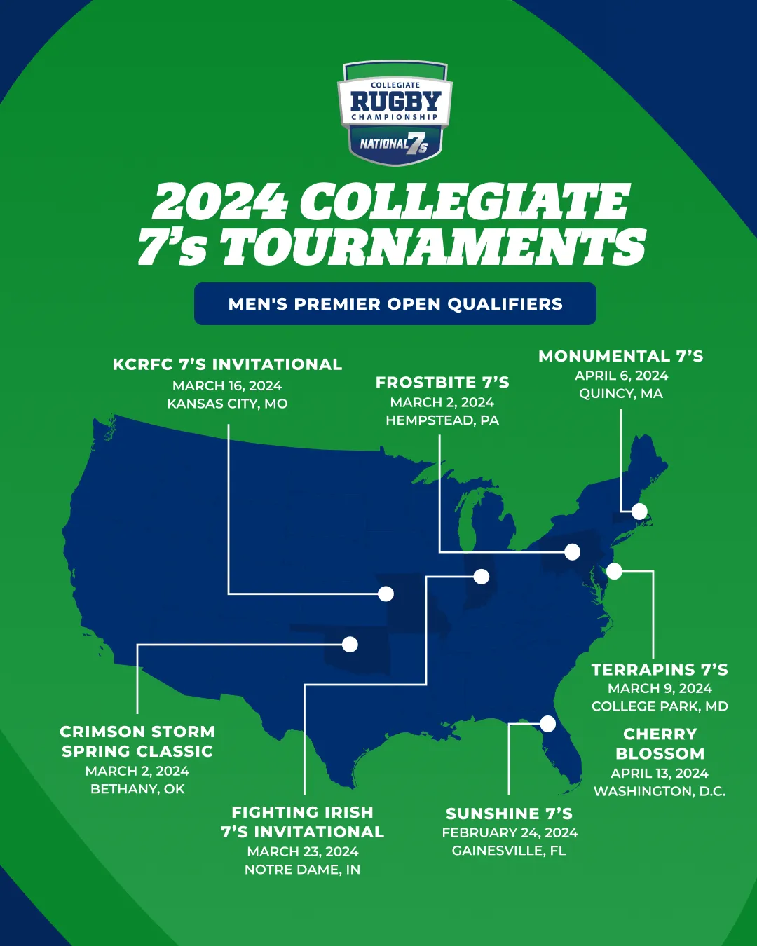 For the 32-team men’s Premier Cup, open to teams from all divisions, the “Road to the CRC” opens Feb. 24 in Gainesville, FL., as the University of Florida hosts Sunshine 7s, the first of eight, open automatic qualifying tournaments spanning as many weeks and seven states.